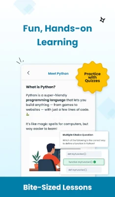 - Bite-Sized Lessons: Absorb Python concepts through short, digestible lessons designed for quick learning and easy recall.