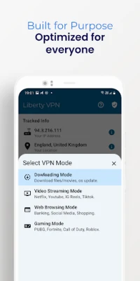 Liberty VPN provides four specialized modes to enhance your online experience: Gaming Mode, Streaming Mode, Downloading Mode, and Web Browsing Mode. Whether you're an avid gamer, a streaming enthusiast, or someone who frequently downloads files, Liberty VPN has the perfect solution for you.