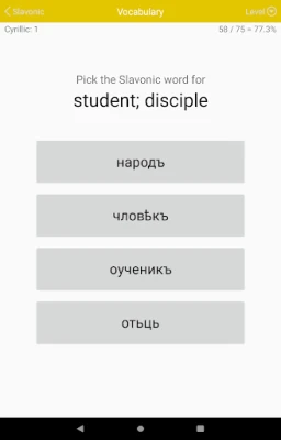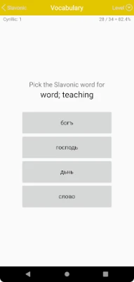The program features an impressive array of 165 levels, each designed to test your comprehension of ten Old Church Slavonic words. These words are carefully selected based on their frequency in the Marianus Gospel codex, ensuring that you focus on the most relevant vocabulary. Additionally, the curriculum includes cumulative levels that revisit previously learned material, bringing the total to 187 levels of engaging content.