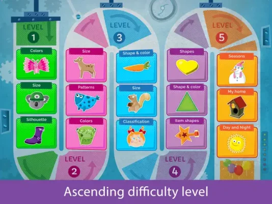 The TinyHands Sorting game consists of 12 boards, each increasing in difficulty. These boards are thoughtfully designed to represent basic concepts familiar to children: