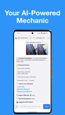 Upload a photo of any visible damage to your vehicle. Mechanic AI will identify the affected area, assess the severity, and calculate repair costs, including labor and parts, based on your vehicle's specific model.