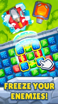 Merging Freeze tiles unleashes an icy wave that targets enemy forces. This powerful ice strike temporarily immobilizes all enemy machinery in its path, slowing their advance and granting you precious time to fortify your defenses and strategize your next moves. Utilize the freeze effect wisely to disrupt enemy plans and maintain control of the battlefield.