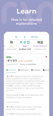 This level of detail allows learners to explore Korean in various contexts, whether it’s a sentence from a dictionary, song lyrics, or dialogue from a drama. By understanding the meaning, syntax, and grammar patterns, you can deepen your knowledge and continue your learning journey with ease.