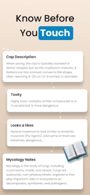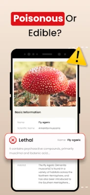 After identification, the app presents a comprehensive result page. Users can access essential details such as the mushroom's name, edibility, habitat, safety tips, and intriguing facts, enriching their knowledge about fungi.