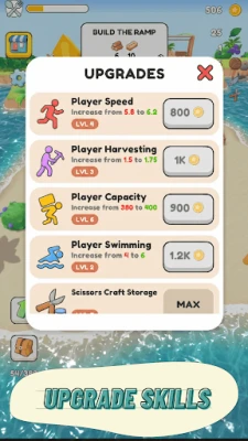 - Upgrade Attributes: Enhance gathering efficiency, capacity, movement speed, and swimming abilities.