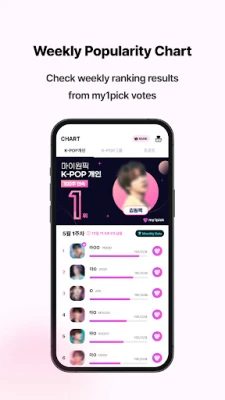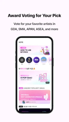 With my1pick, you can easily cast your vote for KPOP, trot, and global stars. The platform updates its voting topics daily, ensuring that you never miss an opportunity to support your idols. Utilize Day Hearts and Onepick Hearts to make your votes count. As the official voting platform for major Korean award shows, including the Golden Disc Awards, Seoul Music Awards, and Dream Concert, my1pick is your go-to app for all things KPOP voting.