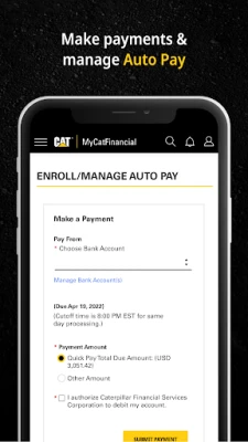 Manage your Cat Financial accounts and contracts on the go. Review important payment and contract details and make updates to your personal information from your phone or tablet wherever the job takes you. Chat with our customer service team, send us an email or give us a call - all within the app. Managing your account with Cat Financial has never been easier.