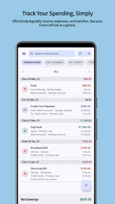 With MyMoney Tracker, tracking your finances becomes a breeze. The user-friendly interface allows you to quickly log all your expenses, income, and account transfers. You can easily access your complete transaction history, which can be filtered by day, month, year, or a custom date range. The instant search feature enables you to find specific transactions across descriptions, notes, categories, and accounts, making financial management more efficient than ever.