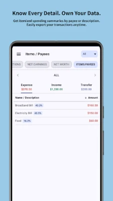 Gain valuable insights into your financial health with MyMoney Tracker's analytical tools. You can analyze your net earnings by comparing income versus expenses, with detailed breakdowns by category. Tracking your net worth—assets versus liabilities—allows you to see how your financial situation evolves over time, whether at the end of the month, year, or on a specific date. Additionally, you can identify spending habits with summaries categorized by item or payee, helping you make informed financial decisions.