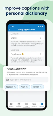 Nagish allows users to create a personal dictionary by adding custom words, phrases, or acronyms that are frequently used in their conversations. This feature enhances transcription accuracy, ensuring that the app recognizes the specific language and terminology that matters most to you.