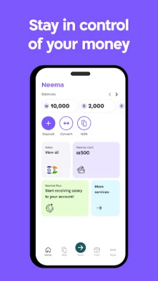 Transfer money securely and swiftly between Neema customers. This feature allows for quick and easy transactions, making it ideal for friends and family who also use Neema.