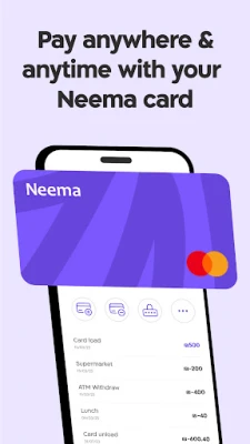 Enhance your Neema experience with the Neema prepaid Visa card. Use it to shop worldwide or withdraw cash from ATMs, making your money accessible wherever you go.