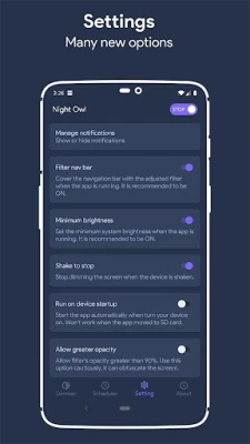 For those moments when you need to quickly adjust your settings, Night Owl offers a convenient shake feature. Simply shake your device to stop the app, providing instant control when you need it most. Additionally, you can use quick setting tiles to start or stop the app with ease.