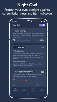 With Night Owl, you have complete control over the filter intensity. You can easily adjust the level of blue light filtering directly within the app or from the notification panel. This flexibility allows you to customize your experience based on your environment and personal preferences.