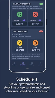 Night Owl features a smart scheduling option that lets you automate the app’s functionality. You can set it to start and stop automatically based on a timer or the sun scheduler, ensuring that your screen is always optimized for nighttime use without any manual intervention.