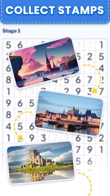 Advance through levels to travel from city to city! Collect gems 💎 and unlock exclusive stamps featuring famous landmarks 🎑. This rewarding Number Match journey tracks your achievements across various countries.