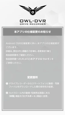 Thank you for your continued support of our products. We are excited to announce important updates regarding the OWL-DR901W Drive Recorder app, following recent changes to the Android OS specifications. For detailed information, please refer to the user manual available at the bottom of the product page.