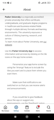 Introducing the Parker University mobile app - your ultimate companion throughout your academic journey. Seamlessly designed to be the single source of university information, it empowers current students with instant access to schedules, important announcements, campus events, and vital updates. From class timetables to campus news, the app streamlines communication, ensuring you never miss a beat. Stay connected, stay informed, and stay ahead with the Parker University mobile app.
