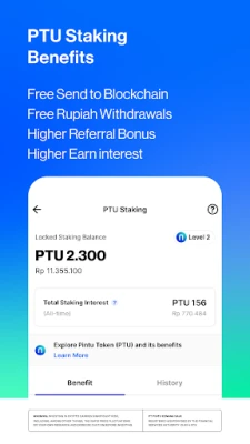 Stake PTU tokens to enjoy a range of benefits, including free blockchain transfers, free IDR withdrawals, referral bonuses, and higher earning yields. Exclusive rewards such as Traveloka vouchers, XXI Premiere tickets, Tokopedia vouchers, Mobile Legends Diamonds, and Boga Group vouchers are also available for stakers.