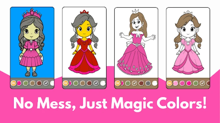 Bring your princess world to life with an extensive palette of over 160 colors, featuring pastels, bold tones, patterns, and textured effects. The app allows for endless color combinations, enabling children to express their artistic vision freely. Whether they prefer soft hues or vibrant shades, the possibilities are limitless.