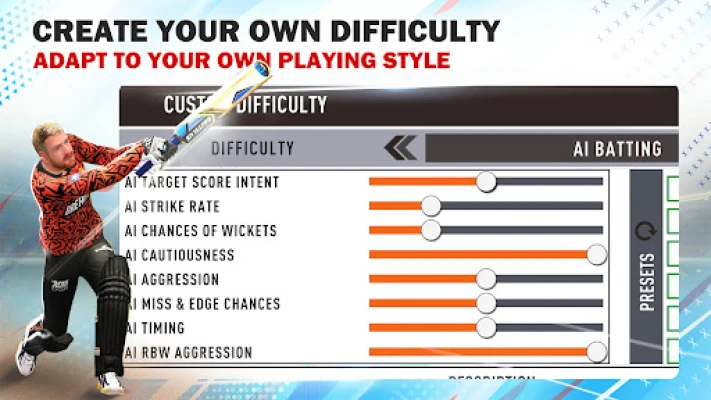 For the first time in mobile cricket gaming, Real Cricket 24 introduces Custom Difficulty. This innovative feature allows you to adjust the AI to match your unique play style. With over 20 customizable gameplay elements, you can fine-tune the AI’s batting and bowling strategies, including strike rate, aggression, bowling speed, spin, and fielding accuracy. Whether you seek a fierce challenge or a more relaxed match, you can create a personalized cricket experience that keeps you engaged and entertained.