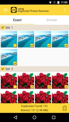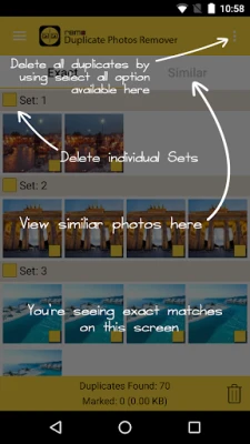 After the scanning process, the app organizes duplicate photos into sets for easy viewing. This allows you to quickly assess which images you want to keep and which ones can be deleted.