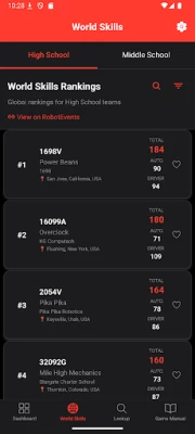 For the V5RC, users can view World Skills Rankings and TrueSkill Rankings, offering a competitive edge by understanding where teams stand globally.