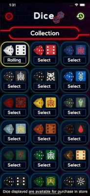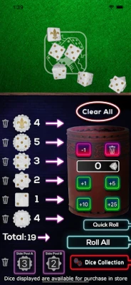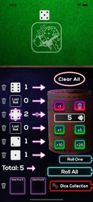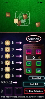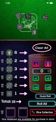 After rolling, the app automatically sorts your dice into six rows based on their values, making it easy to track your results. If you’re not satisfied with your roll, simply tap or swipe to re-roll any die of your choice. Need to remove a die? A quick tap or swipe does the trick. The 'Last Roll' Button allows you to quickly repopulate any dice you’ve just rolled, streamlining your gaming experience.