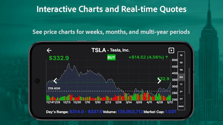 - Interactive Price Charts: Tap any ticker in your portfolio to view price charts spanning weeks, months, or even multi-year periods. This feature allows for comprehensive analysis of stock trends.