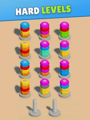 Dive deeper into the game with the screw pin puzzle mode, where arranging screw pins in the correct order becomes a captivating challenge. This mode demands precision and a keen eye for detail, transforming each puzzle into a satisfying endeavor. The integration of nuts and bolts with color sorting tasks ensures a diverse gameplay experience that caters to various puzzle-solving preferences.