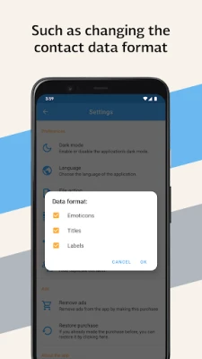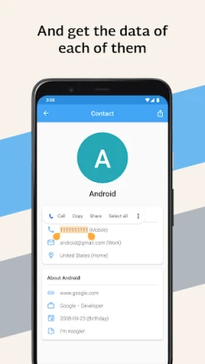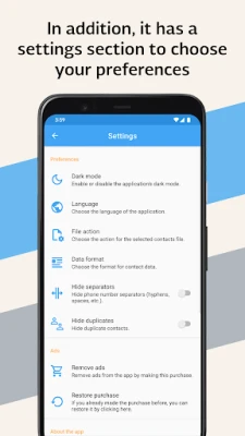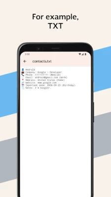 With this application you can share or backup your contacts in different formats: TXT, PDF, CSV and VCF, quickly and easily.