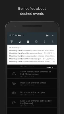 Stay informed with real-time push messages from the MobileKey event management system. This feature alerts you to important events, such as unauthorized access attempts or door status changes. By receiving instant notifications, you can take immediate action to address any security concerns, ensuring the safety of your property.