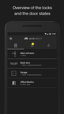 The MobileKey system provides a detailed overview of door statuses, particularly when utilizing a DM cylinder. This feature allows users to monitor the current state of each door, ensuring that you are always informed about access points within your premises. Whether a door is locked, unlocked, or in need of maintenance, the MobileKey application keeps you updated in real-time.
