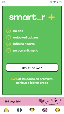 The app operates on a freemium model, offering a free plan that includes access to all quizzes and daily content, supported by short video ads. For those seeking an enhanced experience, the premium version (smart_r+) removes ads, allows students to retake quizzes for mastery, and provides infinite hearts. Remarkably, 84% of students using the premium version achieve higher grades, making it a smart investment in their education.