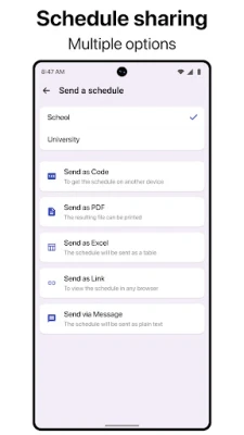 Collaboration is key in both academic and professional settings. If a friend or coworker needs assistance with their schedule, Smart Timetable makes it easy to share yours. You can send your schedule via a unique code, a link to the web version, or through other convenient options. This feature fosters teamwork and ensures everyone stays on the same page.