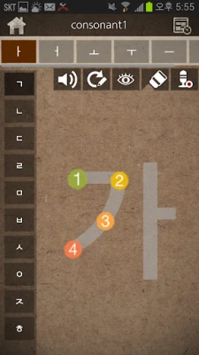This application is structured to enhance a step-by-step learning experience, focusing on the pronunciation and stroke order of Korean letters. Each stroke order is clearly numbered, allowing learners to easily follow along and grasp the writing techniques of Korean consonants and vowels.