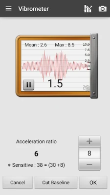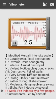 The Vibrometer feature of the app employs your phone's sensors to measure vibrations, including seismic activity. It provides a reference based on the Modified Mercalli Intensity (MMI) scale, allowing users to gauge the intensity of vibrations accurately. If the readings appear inaccurate, users can calibrate the app to ensure that the maximum value aligns with the expected range of 10-11 on the MMI scale. However, it’s essential to remember that results should be used for reference only, as the performance and sensitivity of Android devices can vary significantly.