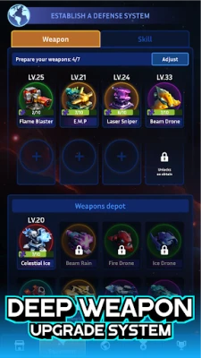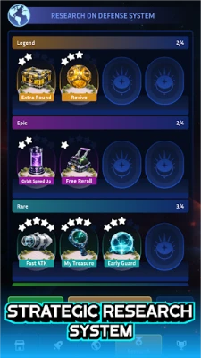 Enhance your planet's capabilities through a robust research system that utilizes research cards to provide permanent bonuses. This long-term progression feature adds significant depth and strategy to your idle space defense experience. Players can invest in upgrades that will benefit them throughout their journey, making each decision impactful and rewarding.