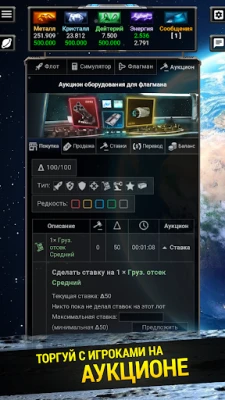 In Space Kings, warfare is just one aspect of gameplay. The economy plays a vital role as well. Collect credits, the in-game currency, through expeditions and trade with other players at the auction. Purchase modules for your flagship, acquire artifacts, or pay for services that can give you an edge in your conquests.