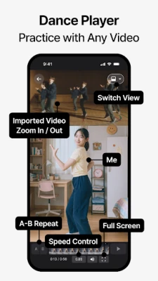 The player allows you to watch your video side by side with a reference video, enabling precise comparisons. Features like loop, speed control, and accurate scrubbing are tailored for dancers, ensuring you can focus on perfecting every move.