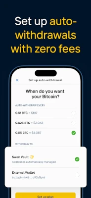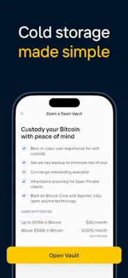 Take your Bitcoin security to the next level with Swan Vault, our institutional-grade cold storage solution. This advanced security feature ensures that your Bitcoin is safeguarded against potential threats, giving you peace of mind as you build your wealth.