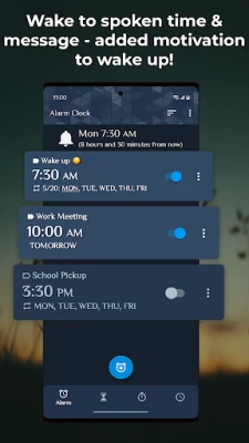 This alarm app is not just for waking up; it serves multiple purposes. Use it as a reminder app that speaks the time and important messages, helping you stay organized throughout the day. Additional features include: