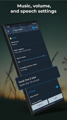 - Speak time: The app can announce the time after the alarm starts, repeating at intervals you choose.
