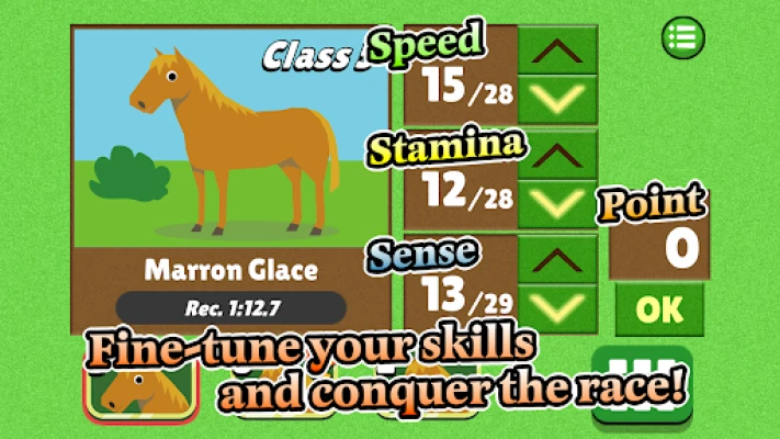 Each horse in the game possesses three critical attributes: speed, stamina, and sense. These features determine your horse's performance during races and can be customized using points earned from victories.