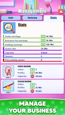 Maximize your park's potential by investing in upgrades. Enhance rides, improve ticket booths, and optimize parking areas to boost revenue and operational efficiency. Strategic upgrades will not only increase your income but also improve the overall guest experience, making your park a must-visit attraction.