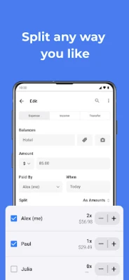 - Flexible Splits: Choose to split expenses equally, by amount, or customize shares to fit your needs.
