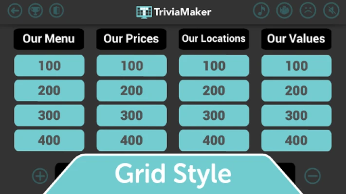 Trivia Maker is an exciting "build your own quiz / gameshow" app. The layout of the board is a lot like the game Jeopardy, Family Feud, Who Wants to be a Millionaire, or other trivia game shows.