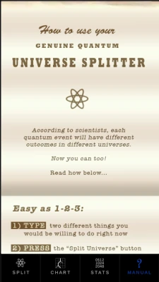 If you are intrigued by the Many Worlds interpretation of quantum behavior, Universe Splitter is an essential tool for your decision-making arsenal. Even if you are skeptical, consider it the most random coin-flip app available, utilizing the most unpredictable phenomenon in the universe: a single quantum event!