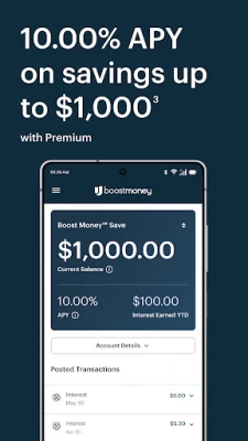 Boost Money™ also offers an industry-leading Annual Percentage Yield (APY) on your savings. With a Premium subscription, you can earn an impressive 10.00% APY on savings balances up to $1,000. For balances exceeding $1,000, you still benefit from a competitive 3.05% APY. This means your money works harder for you, helping you grow your savings without the burden of a minimum balance requirement.