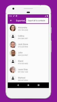 Many users have old backups in vCard format from previous phones. The VCF reader simplifies the restoration process. Just navigate to the file, and on the contacts list screen, you can export all contacts to your phone's memory or Google account with just a few taps.